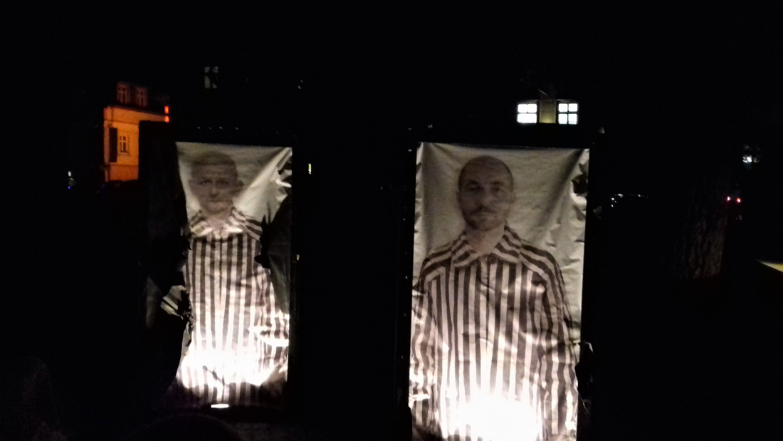 Ukryty w ciemności widz, wiedziony jest przez noc dyskretnym światłem reflektorów, które przesuwa się jak wskazówka zegara. W tej przestrzeni dokonuje się niezwykłe misterium. Przy dźwiękach przejmującej muzyki skrzypiec trumny-sarkofagi unoszą się stopniowo do pozycji pionowej. Widzom ukazują się fotografie młodych ludzi w pasiakach. Z sarkofagów w powolnym, regularnym rytmie wyznaczonym rytmem i kierunkiem zegara, wyłaniają się aktorzy. Niektórych można rozpoznać na zdjęciach. Następnie zdzierają pasy z pasiaków i półnadzy przechodzą na drugą stronę pomnika-bramy. Całość trwa prawie godzinę – ma się wrażenie, że to godzina, która przechodzi do wieczności. Spektakl, mimo że jego bohaterem jest czas, nie ma formy linearnej. Prowadzi widza przez ciąg wolnych skojarzeń, zestawionych na zasadzie kolażu i zależnych od miejsca obserwacji. Niewiele udało mi się zobaczyć – docierały do mnie jedynie strzępy, fragmenty, które nie składały się w spójną całość. Jednak potem, gdy widzowie się rozeszli, stałam przez dłuższą chwilę w tej już pustej przestrzeni i czułam, że była naładowana szczególną energią. Prawdziwa sztuka dzieje się w przestrzeni między aktorem a widzem: ważne jest to, co wyniesie widz. Tym, co wyniosłam z tego niezwykłego misterium była właśnie ta pusta naelektryzowana przestrzeń i cisza, która przeniosła mnie poza czas.